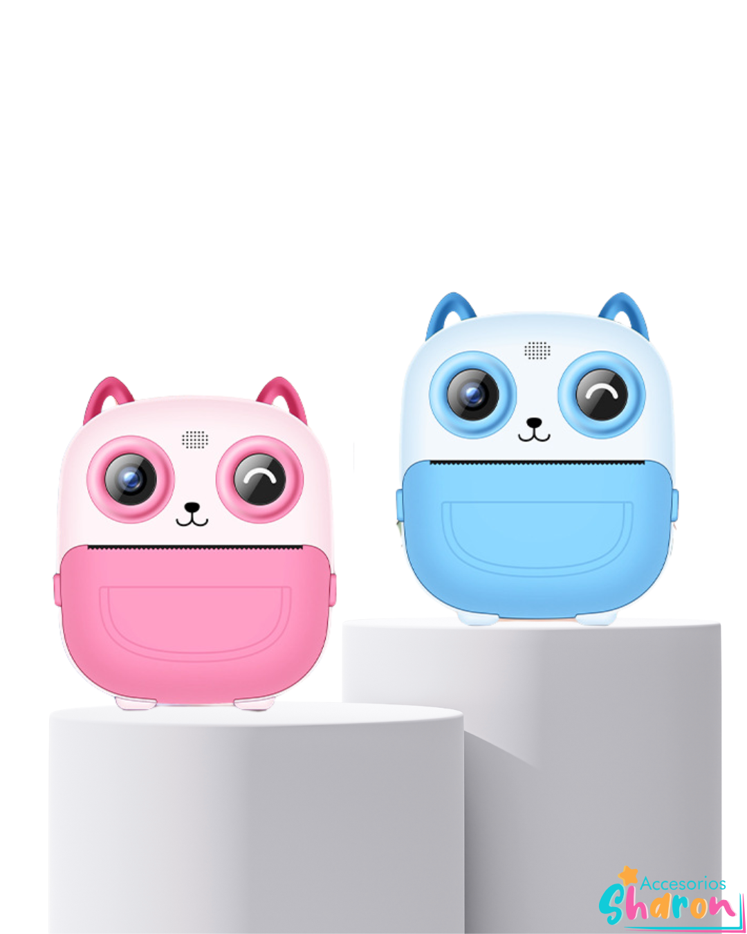 Cámara digital infantil con diseño de animal (ojos grandes, orejas, compartimiento inferior)