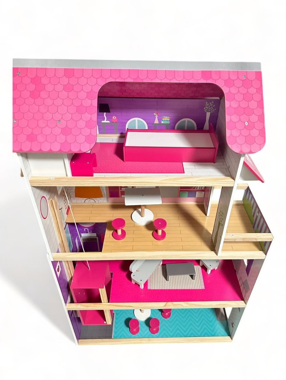 Una gran casa de muñecas de madera de 4 pisos con juegos de muebles a juego, dormitorio de princesa, sala de estar, sala de cocina, que incluye litera Rosa ensamblada, sofá y mesa blancos, etc. ¡La parte superior de la lista de deseos de cada chica rosa!