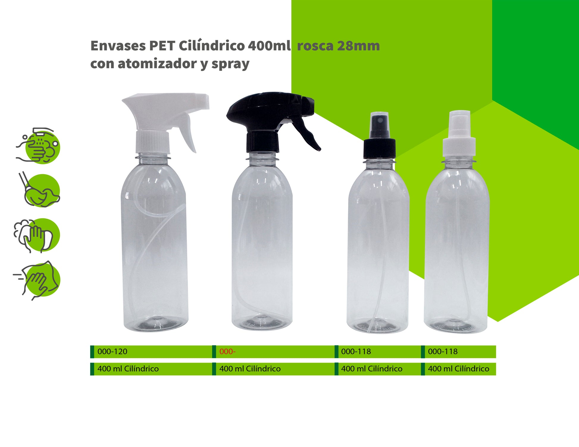 Envases PET cilíndricos 400ml rosca 28mm con atomizador y spray
