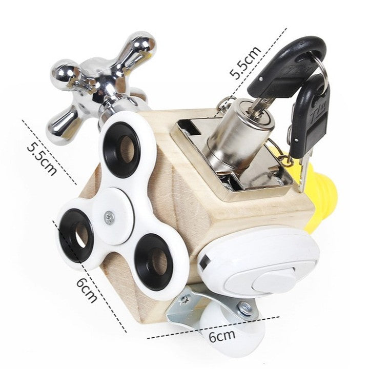 Juguetes sensoriales para niños pequeños, adecuados también para niños curiosos y autistas. Juguete interactivo de madera tiene 6 lados. El cubo ocupado incluye espiral, cierre de resorte, interruptor unidireccional, rueda universal, interruptor de grifo, tornillo giratorio. Es perfecto para recrear de manera sana a tus peques y brindarles otra alternativa a los productos electrónicos. Cultiva la atención y el aprendizaje de los niños, capacidad visual, oído y desarrollo táctil.