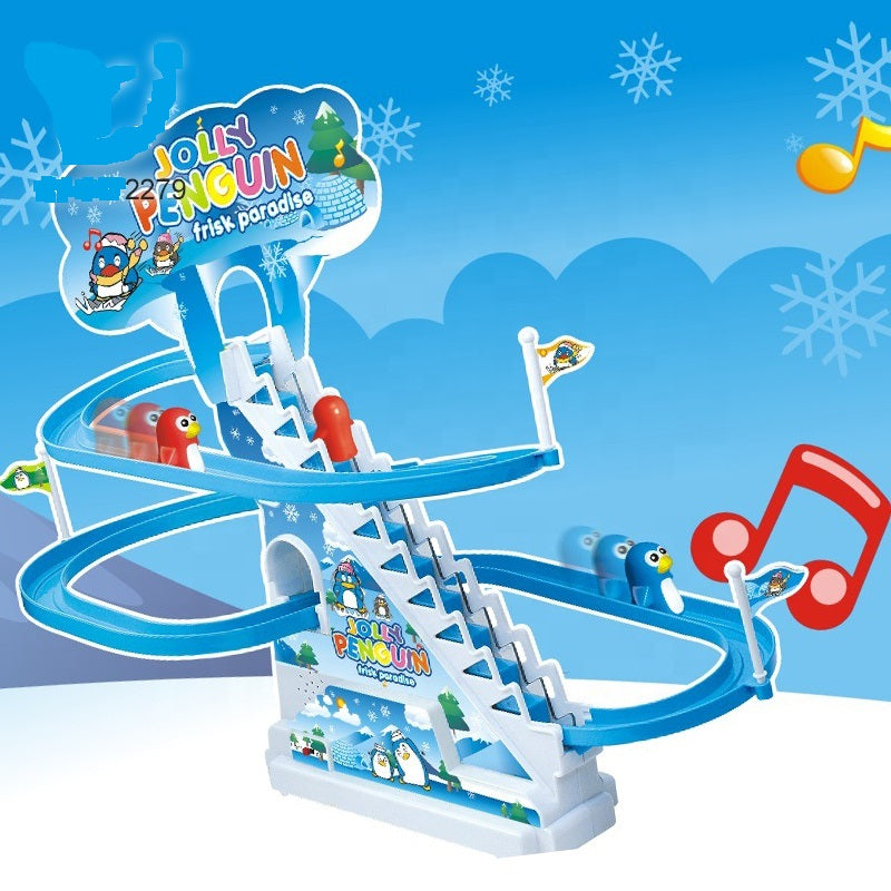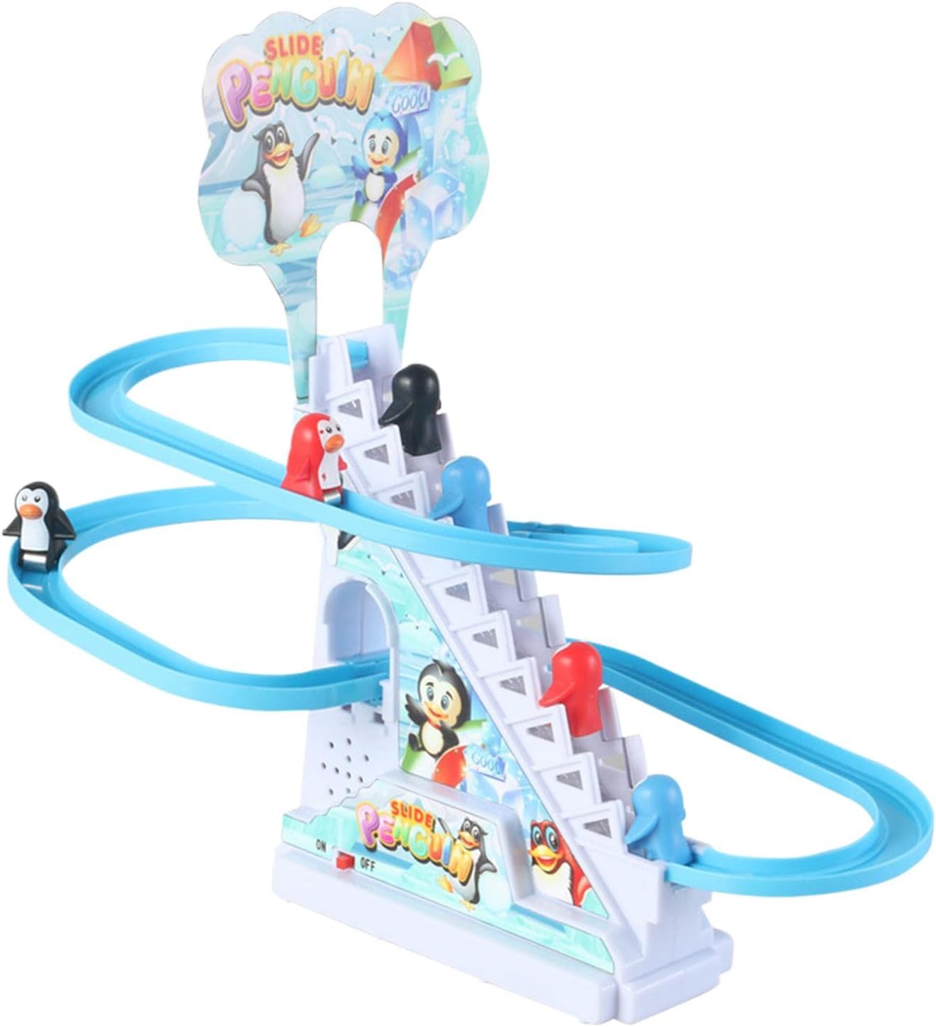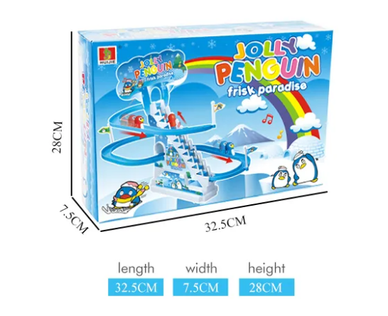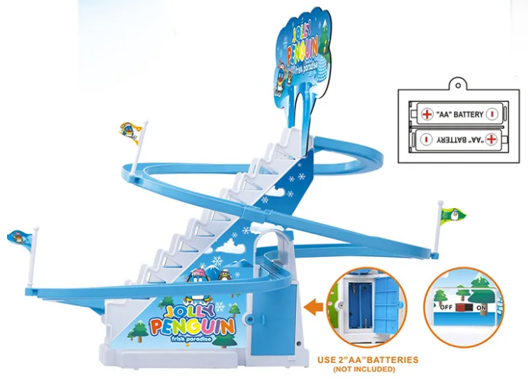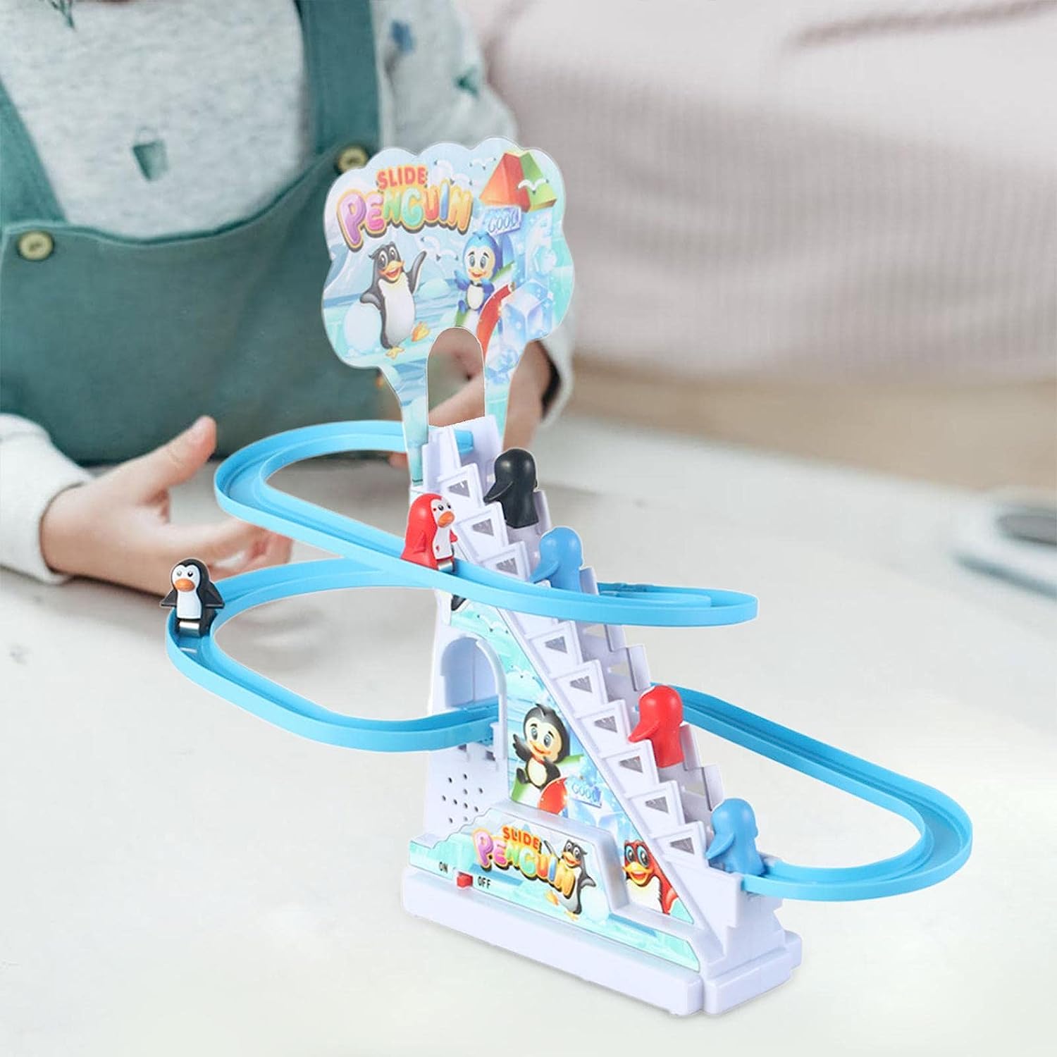 Viene con sonidos, y los pingüinos subirán escalera con la música y luego se deslizan hacia abajo por el tobogan.