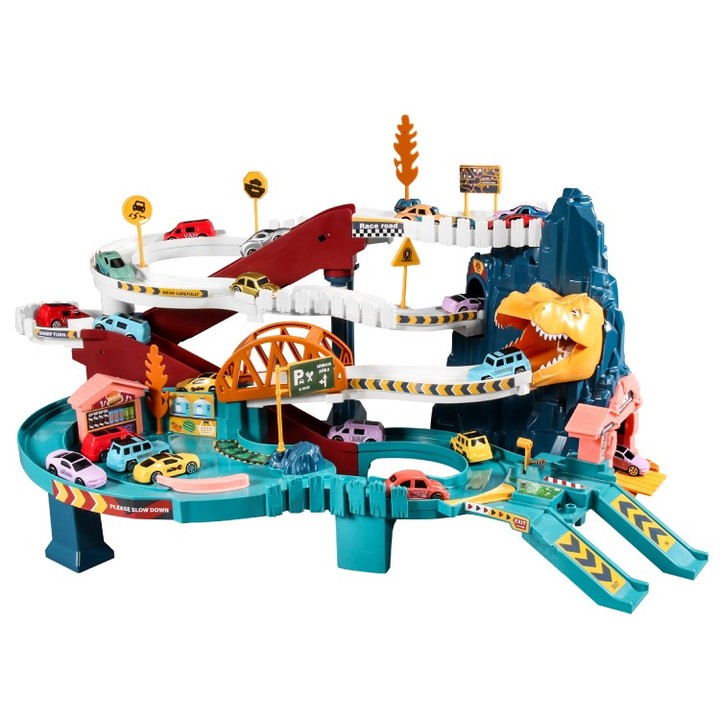 Juego perfecto para nuestros principes de la casa, para quienes les encantan los dinosaurios: pistas que se conectan fácilmente, 12 coches para conducir y mucho más.